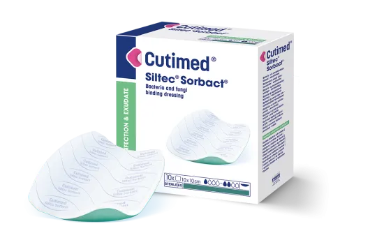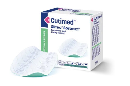 Cutimed Siltec Sorbact är ett bakterie- och svampbindande sårförband som absorberar och håller kvar sårvätska, baserad på Sorbact Technology.